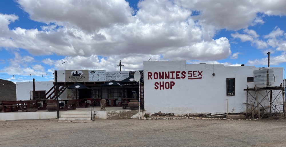 Wij besluiten de volgende dag de beroemde R62 te rijden naar onze bestemming in de Swartberg mountains. Ik stel voor om in elk geval een stop te maken bij Ronnie’s Sex Shop. Het blijft even stil in de auto. ‘Heb je het wel naar je zin ?’, vraagt mijn echtgenote. Ik leg uit dat de toevoeging ‘sex’ destijds een grap was van Ronnie’s vrienden. Ronnie’s shop, waar hij boerderij producten verkocht, liep absoluut niet. Na de naamsverandering werd het een hype. Daar moet je stoppen. Dat moet je zien.